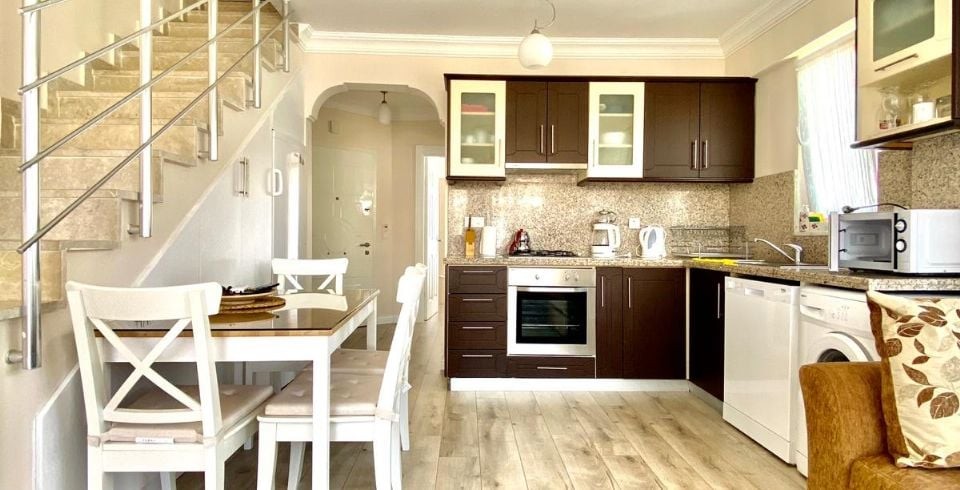 Mutfak : Modern Amerikan mutfak, buzdolabı, bulaşık makinesi, çamaşır makinesi, su sebili, fırın, mikrodalga fırın, 4’lü ocak, elektrikli su ısıtıcısı, 6 kişilik yemek takımı, tava, tencereler, çatal, bıçak vs. bulunmaktadır.