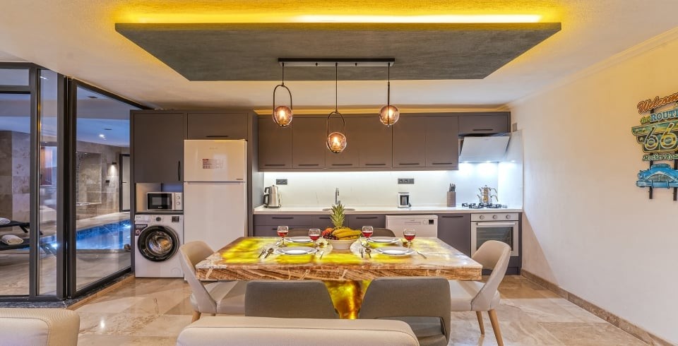 Mutfak: Amerikan mutfakta buzdolabı, bulaşık makinesi, fırın, 4'lü ocak, mikrodalga fırın, ketle, tost makinesi, yemek masası, yemek takımları, çatal ve bıçak takımları, tencere ve tava takımları, bardaklar bulunmaktadır.