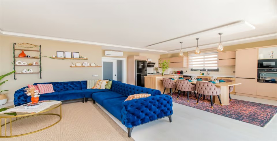Salon: Modern şık oturma grubu, televizyon, klima, havuz terasına çıkış bulunmaktadır.