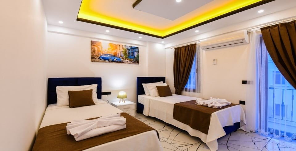 2. Yatak Odası : 2 adet tek kişilik yatak, klima, komodin, makyaj masası, elbise dolabı, banyo ve tuvalet bulunmaktadır.