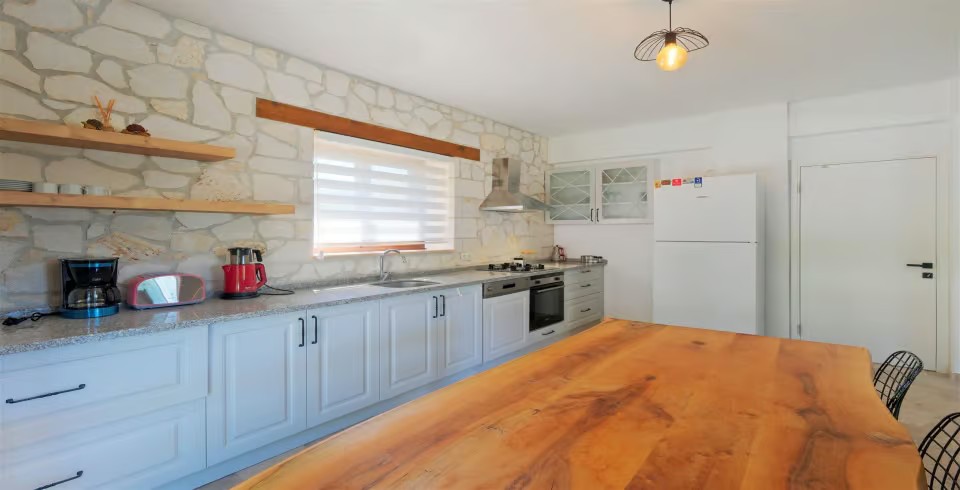 Mutfak : Modern Amerikan mutfak içerisinde Buz dolabı, Bulaşık makinesi, Çamaşır Makinesi ,Fırın, 4’lü ocak, Elektrikli su ısıtıcı, Türk Kahve Makinası, Filtre kahve makinesi ,Çaycı, 8 kişilik yemek takımı, Tava, Tencereler, Çatal bıçak vb. bulunmaktadır.