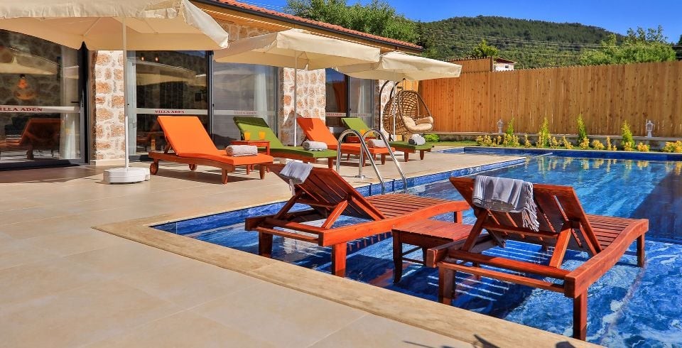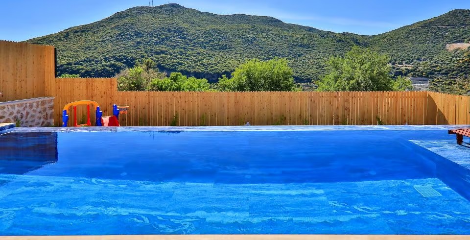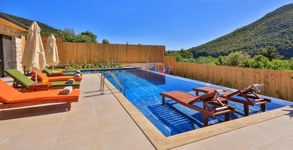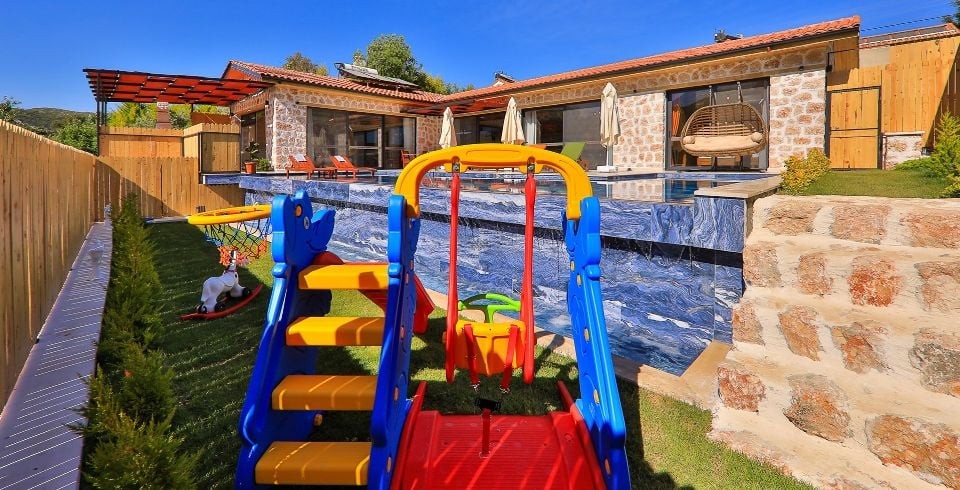 Havuz ve Bahçe: Villamız korunaklı olduğundan dışarıdan kesinlikle görünmemektedir. Geniş  yüzme havuzu ve şezlong bulunan bahçemizde ekstra şezlonglar, şemsiye, yemek masası, salıncak, oyun parkı ve çocuk havuzu bulunmaktadır.