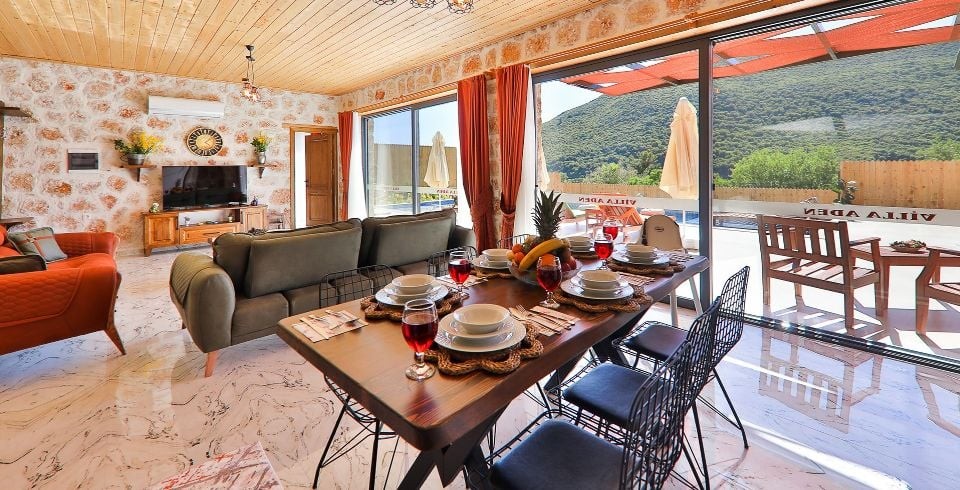 Salon: 2021 yılı içerisinde sitemize dahil olan villamızın iç dizaynı da son modaya uygun olarak modern bir şekilde tasarlanmıştır. Çeşitli dekoratif eşyalarla süslediğimiz salonumuz havuzlu bahçeye açılıyor. Villa Aden’nin salonunda oturma grubu, TV, internet, klima, yemek masası, sehpa bulunmaktadır.