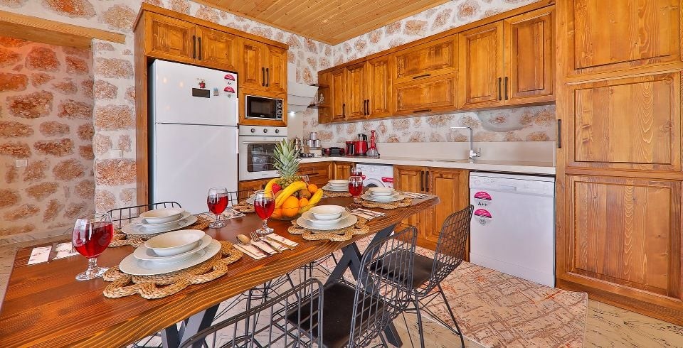 Mutfak: Modern Amerika mutfağımızda 4 kişilik yemek masası, buzdolabı, çamaşır makinesi, mikrodalga fırın, 4’lü ocak, tost makinesi, elektrikli su ısıtıcısı, çatal-bıçak takımı, tencere-tava takımı, bulaşık makinesi bulunmaktadır.