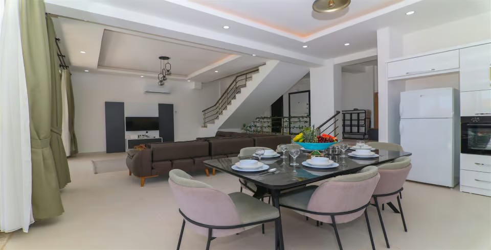 Salon : Oturma grubu, orta sehpa, televizyon, uydu alıcısı, klima, ortak banyo/WC, 6 kişilik yemek masası ve sandalyeler bulunmaktadır.
