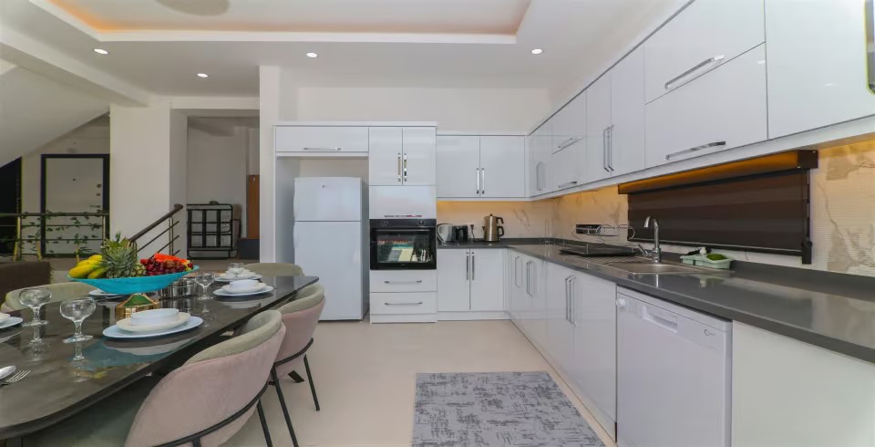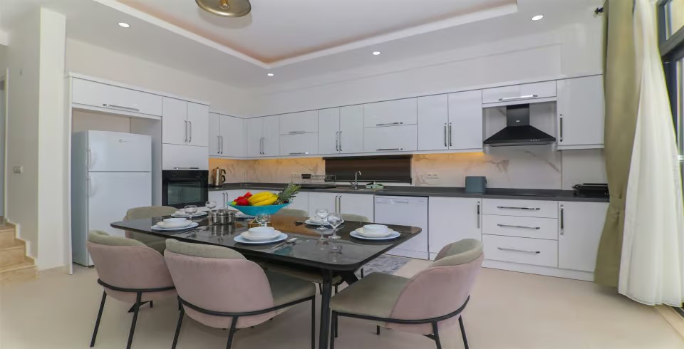 Mutfak : Modern Amerikan Mutfak, buzdolabı, tost makinası, bulaşık makinası, ankastre fırın, davlumbaz, 4’ lü ocak, kettle, kettle, 6 kişilik yemek takımı, çatal bıçak seti, tavalar, tencereler, bardaklar bulunmaktadır.