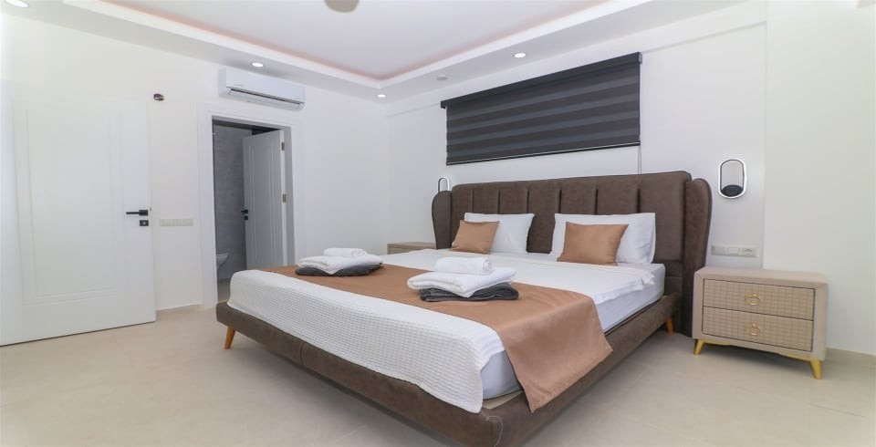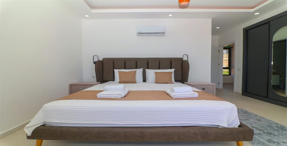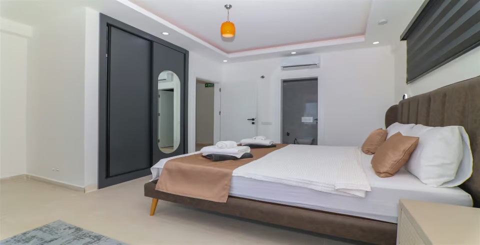 1. Yatak Odası : Klimalı suit aile yatak odası olup, 1 adet çift kişilik yatak , elbise dolabı , makyaj masası , komodin , banyo ve tuvalet bulunmaktadır. (Üst Kat)