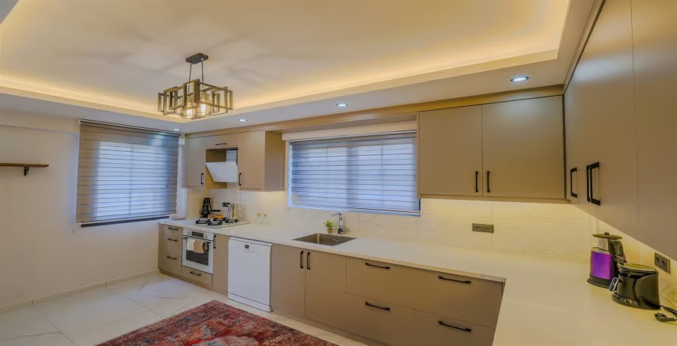 Mutfak: Modern bir Amerikan tipi mutfağa sahip olan villamızın mutfağında bir mutfakta olması gereken tüm araç gereçler mevcuttur. 6 kişi ve daha fazla kişiye yetecek kadar mutfak malzemeleri, bulaşık makinesi, çamaşır makinesi, fırın, ocak, buzdolabı, blender, tost makinesi, çaydanlık ve kettle bulunmaktadır.