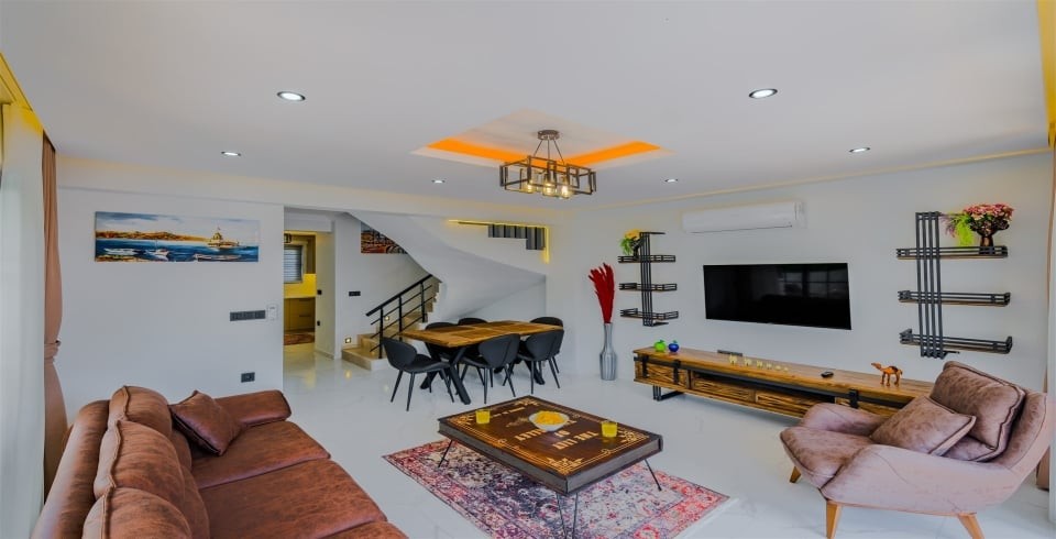 Salon : Özenle döşenmiş açık mutfaklı salon, klima, modern koltuklar, 6 kişilik yemek masası,Tv, bulunmaktadır. Ayrıca salondan havuz terasına çıkış mevcuttur.