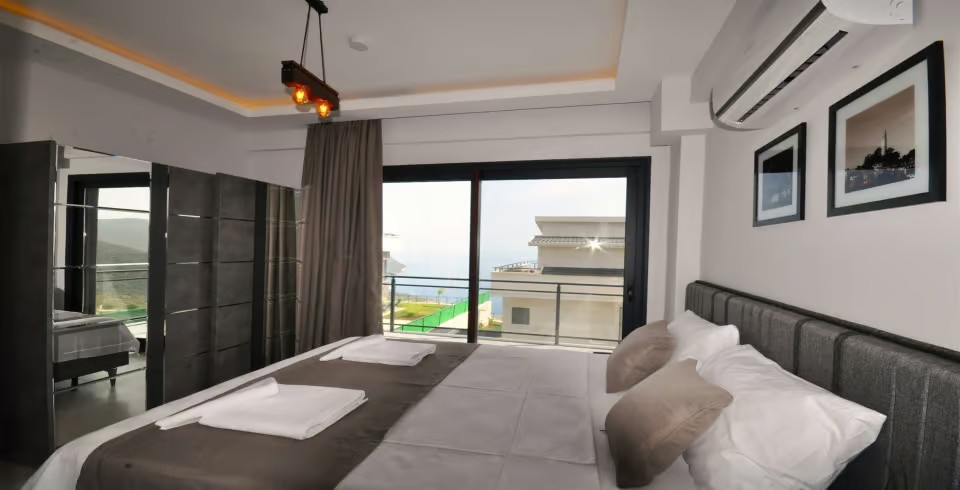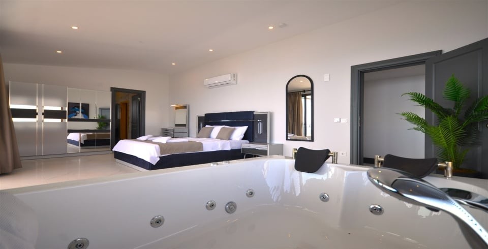 4.Yatak Odası: Lüks Süit Ebeveyn odası, Panoramik Kalkan, Deniz ve Doğa manzaralı olup, Banyo, Sauna, Jakuzi, Şezlong ve oturma grubu mevcuttur.