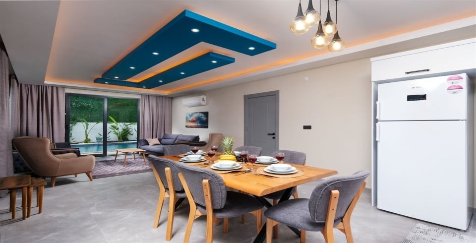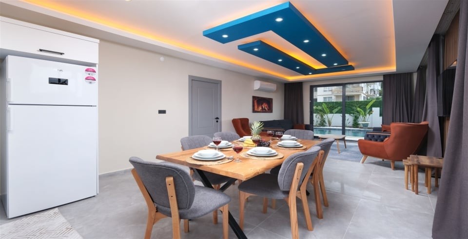 Salon: Özenle döşenmiş salon, modern koltuklar, 6 kişilik yemek masası, LCD TV  ve klima bulunmaktadır.