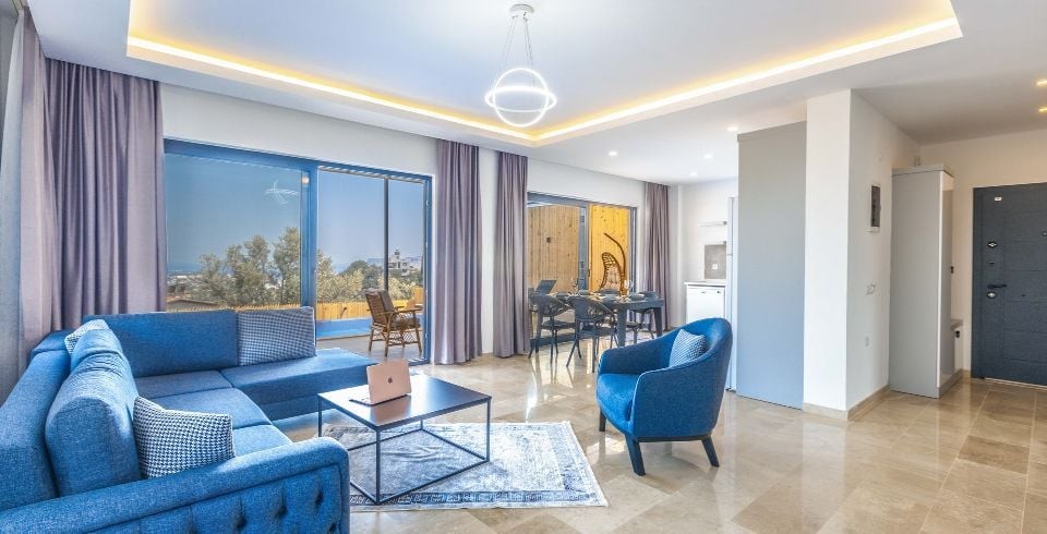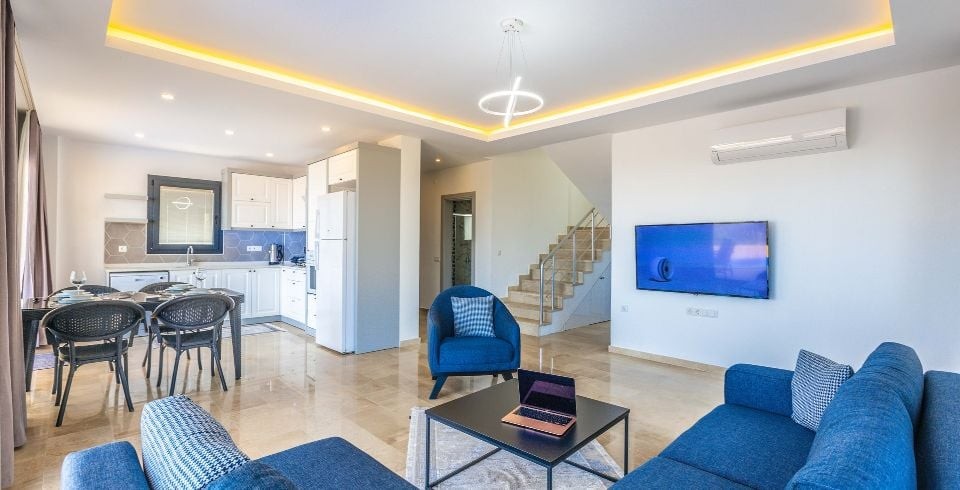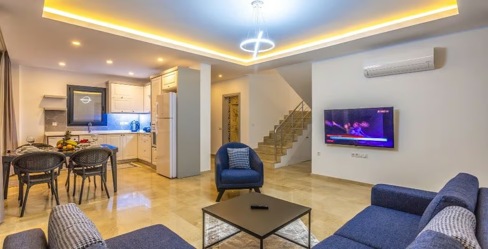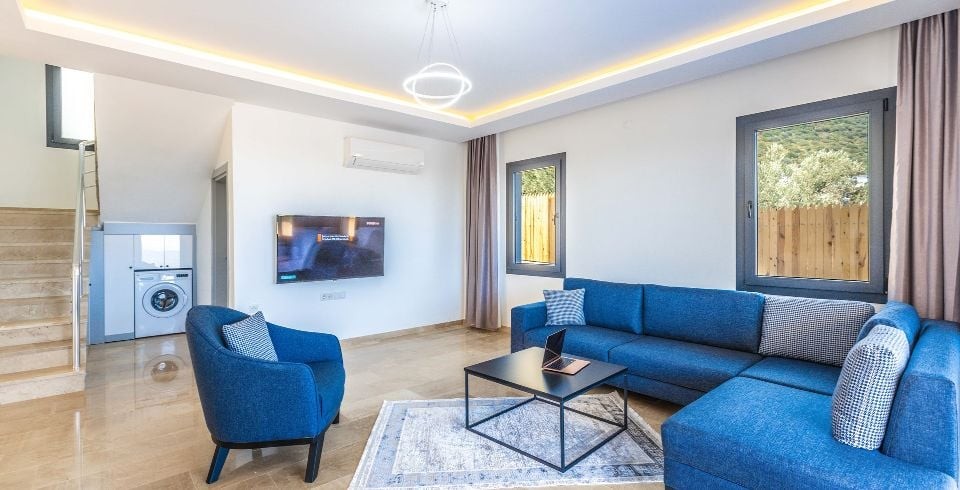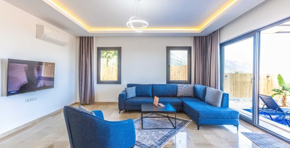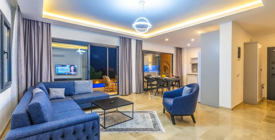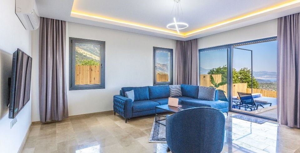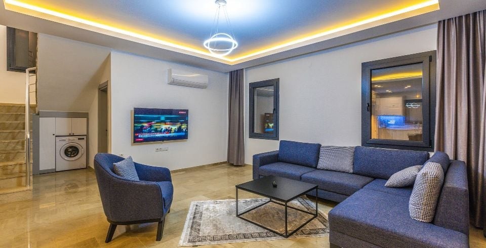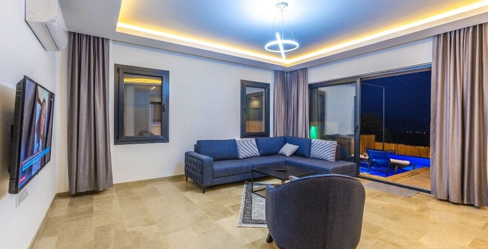 Salon: Salonda klima uydu alıcı, TV, DVD Player, oturma grubu,  koltuğu, lavabo yer almaktadır. Salon havuz katındadır. En üst katta dinlenmek ve güneşlenmek için çok geniş bir seyir terası daha vardır. Bu alanda da oturma gurubu, masa ve sandalye bulunur.