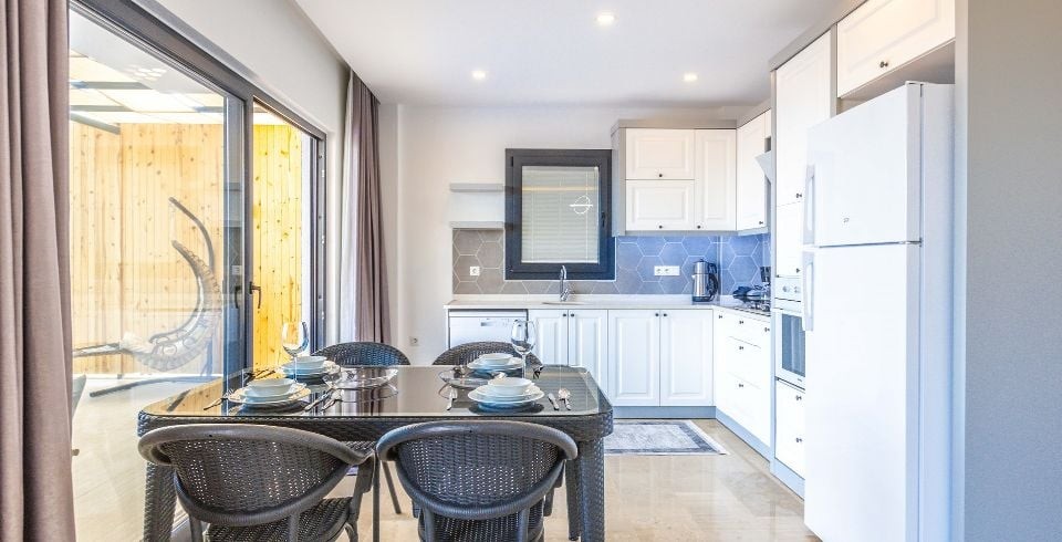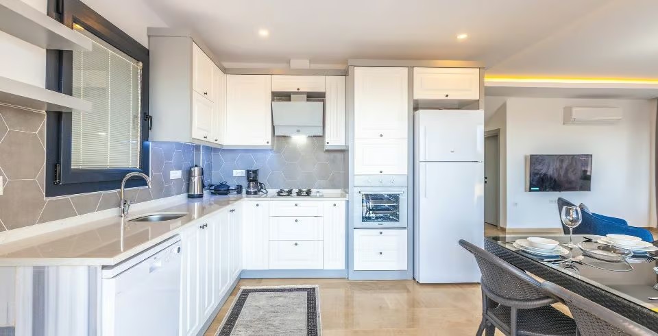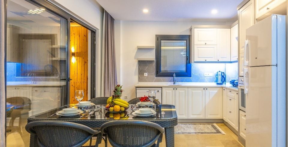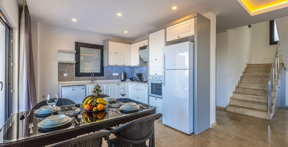 Mutfak: Amerikan mutfak bulunmaktadır. Mutfakta mikrodalga fırın, bulaşık makinası, ankastre fırın, buzdolabı, çamaşır makinası, ankastre 4’lü ocak, elektrikli su ısıtıcı kettle, ekmek kızartma makinası, tencere ve tava takımı,  yemek takımı, kaşık ve çatal seti ve bardaklar bulunmaktadır. Mutfak havuz katındadır.
