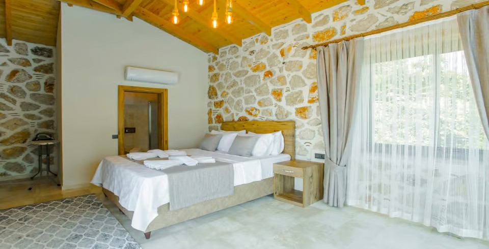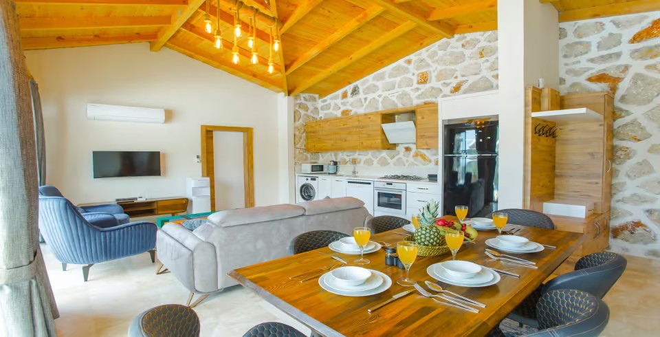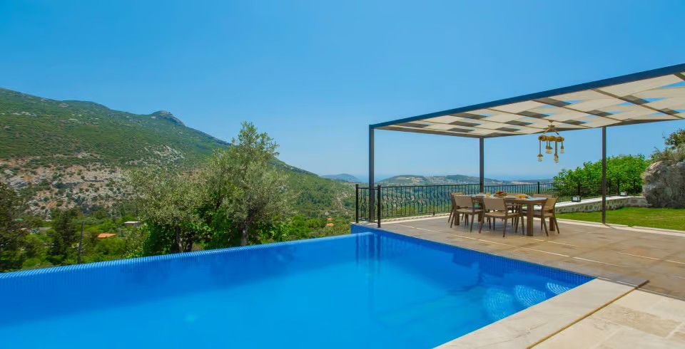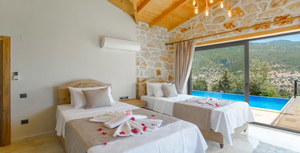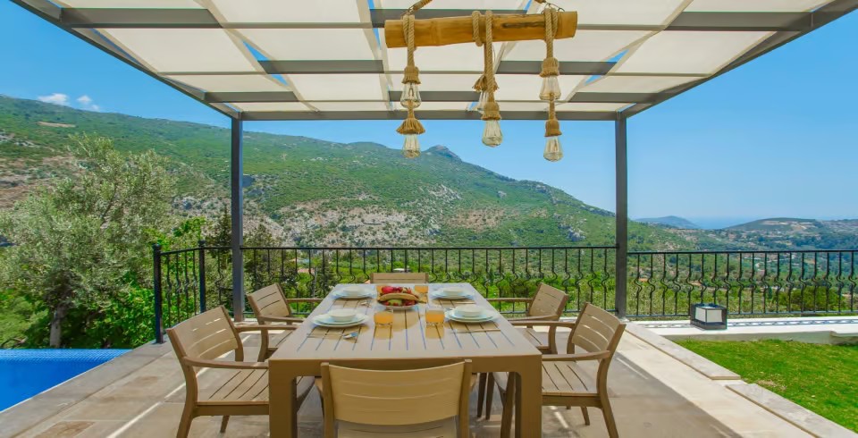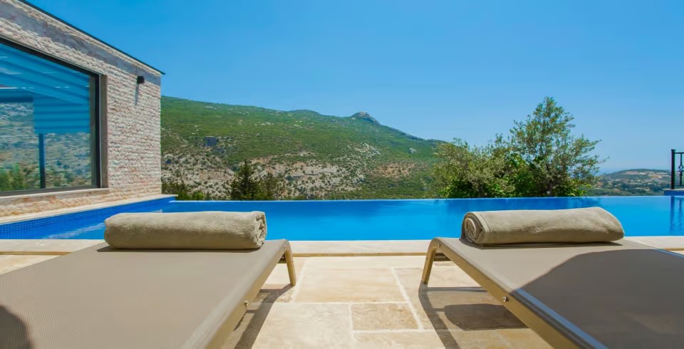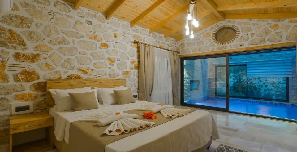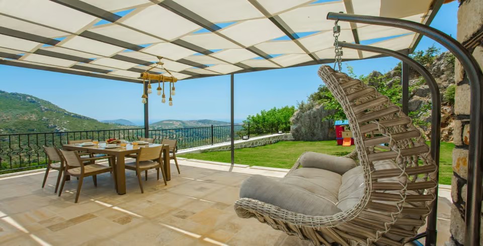 Kiralık, yazlık, muhafazakar tek katlı müstakil villamız Kalkan’ın İslamlar bölgesinde konumlanmıştır. Mimarisinde taş ve taş görünümü kullanılan villamızda otantik esintiler bulunmaktadır. Tasarımıyla göz büyüleyen villamızı vintage görünümü benimseyen misafirlerimiz kiralayabilirler. Yalnızca yaz mevsiminde değil, kış mevsiminde de tatil yapmak isteyen misafirlerimiz için yaz – kış aktif ısıtmalı havuz bulunmaktadır. Hem balayı çiftlerimizin, hem de çekirdek muhafazakar ailelerin ve tesettürlü kadınların rahatlıkla tercih edebileceği villamızın bahçesi, havuz ve havuz terası korunaklıdır. Deniz manzarasından söz etmemek olmaz diyor ve sitemizde fotoğraflardan görebileceğiniz üzere doğa ve deniz manzarasına sahip olan villamızı gönül rahatlığıyla kiralayabilir, Akdeniz villamı tercih edebilirsiniz. Çocuklu, çekirdek ailelerimizi düşünüp bahçemizde oyun alanı, üzeri kapalı yemek masası ve salıncak bulunmaktadır. Villamızın bütün odaları boydan camlıdır ve tüm odalar deniz ve doğa manzarasına sahiptir.