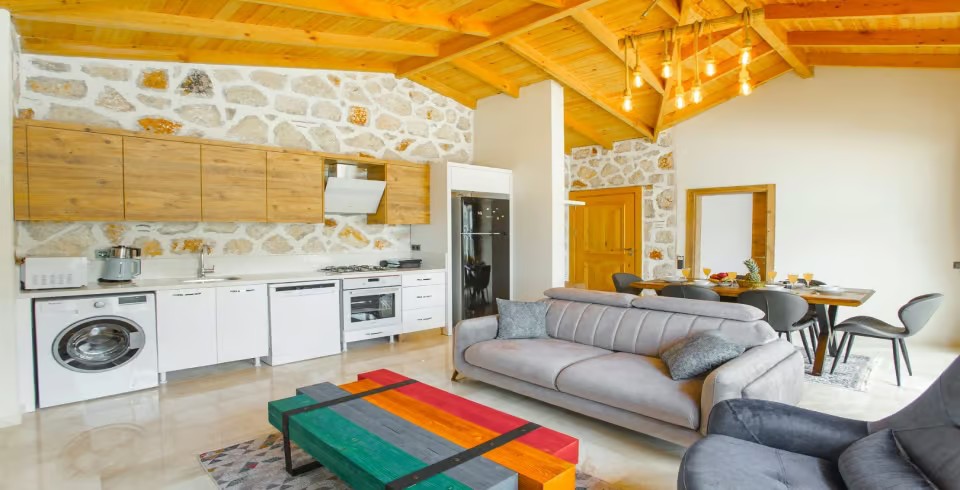 Mutfak : Villamızın geniş Amerikan mutfağı ile sizlere kendi evinizin mutfağı gibi hissettirecek. Ayrıca mutfakta klima, bulaşık makinası, buzdolabı, çamaşır makinası, mikrodalga fırın, tost makinası, ekmek kızartma, su ısıtıcısı, fırın, 4`lü ocak seti ve 6 kişilik geniş yemek masası ile tava tencere vb. mutfak araç gereçlerini kullanma fırsatını sizlere sunuyoruz.