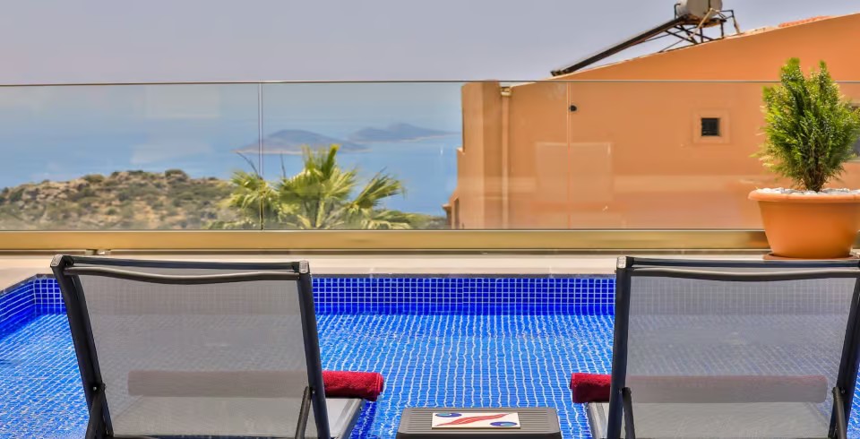 Havuz ve Bahçe : Deniz Manzaralı, Güneşlenme, Özel Havuz, 8 kişilik masa sandalye,8 tane şezlong, Güneşlenme şemsiyesi