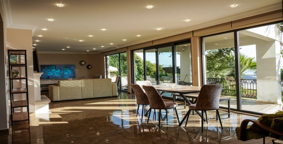 Salon : Salonda klima uydu alıcı, TV, DVD Player, oturma grubu, ütü ve ütü masası, lavabo yer almaktadır ve havuz kenarına çıkış vardır. Salon havuz katındadır. En üst katta dinlenmek ve güneşlenmek için çok geniş bir seyir terası daha vardır. Bu alanda da oturma gurubu ,masa ve sandalye bulunur.