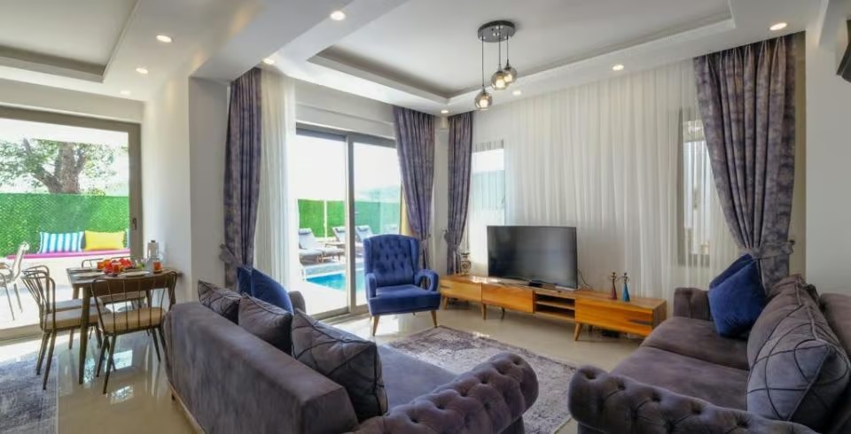 Salon : Villa salonunda sizi şık bir oturma grubu ile klima, televizyon, internet, uydu, koltuk, sehpa ile ferah bir salon bekliyor olacaktır. Havuz terasına çıkış yapılmaktadır.