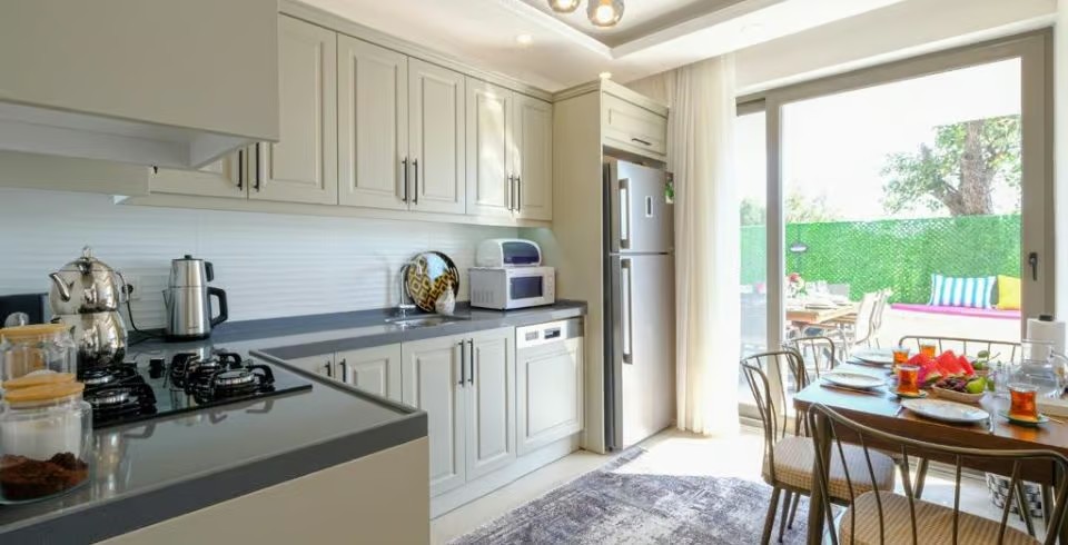 Mutfak : Villamızın geniş Amerikan mutfağı ile sizlere kendi evinizin mutfağı gibi hissettirecek. Ayrıca mutfakta klima, bulaşık makinası, buzdolabı, çamaşır makinası, mikrodalga fırın, tost makinası, ekmek kızartma, su ısıtıcısı, fırın, 4`lü ocak seti ve 4 kişilik geniş yemek masası ile tava tencere vb. mutfak araç gereçlerini kullanma fırsatını sizlere sunuyoruz.