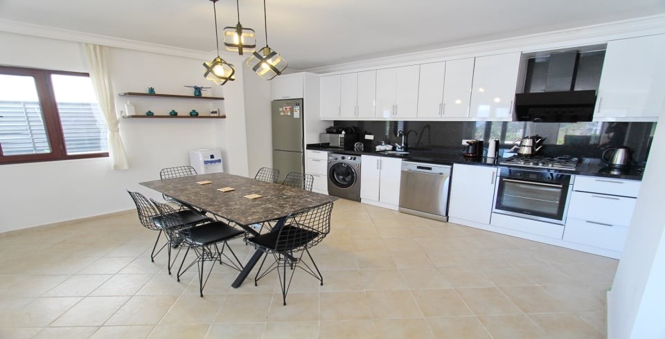 Mutfak: Modern Amerikan mutfakta buzdolabı, çamaşır makinesi, bulaşık makinesi, fırın, mikrodalga fırın, tost makinası, 4'lü ocak, elektrikli su ısıtıcısı, yemek takımı ve mutfak araç gereçleri bulunmaktadır.