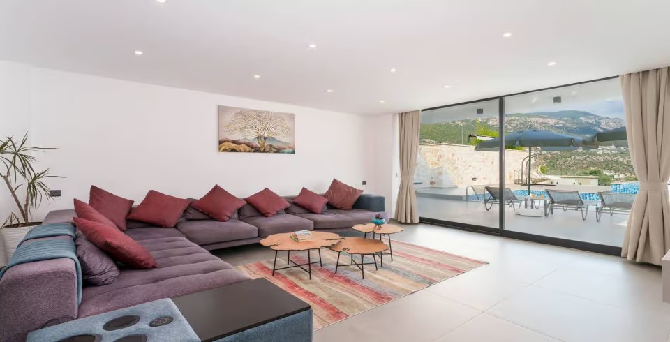 Salon: Muhteşem manzaraya sahip Villa Antares’in salonunda konforlu oturma grubu, TV, DVD oynatıcı, uydu alıcısı, klima yer almaktadır. Salondan havuz terasına geçiş vardır.