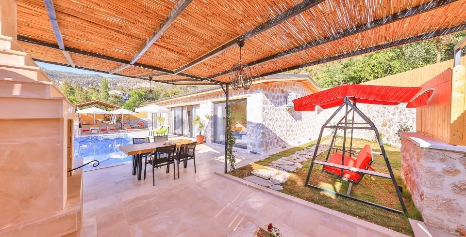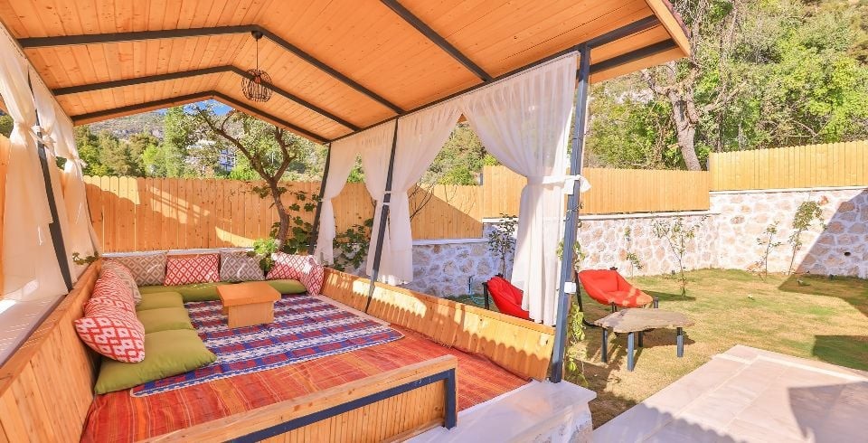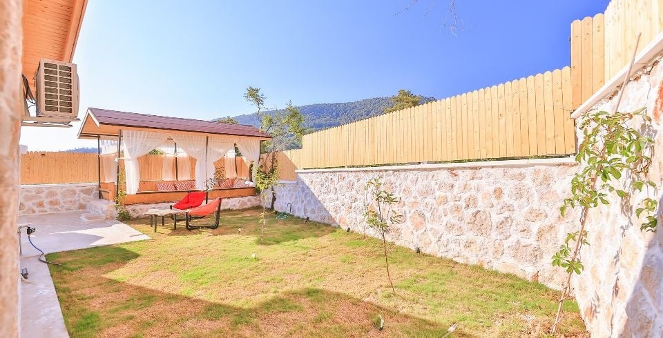 Bahçe : Bahçe içerisinde korunaklı özel yüzme havuzu, şezlong ve şemsiye, çardak, yemek masası ve sandalyeler, bahçe oturma grubu, salıncak ve barbekü yer almaktadır.