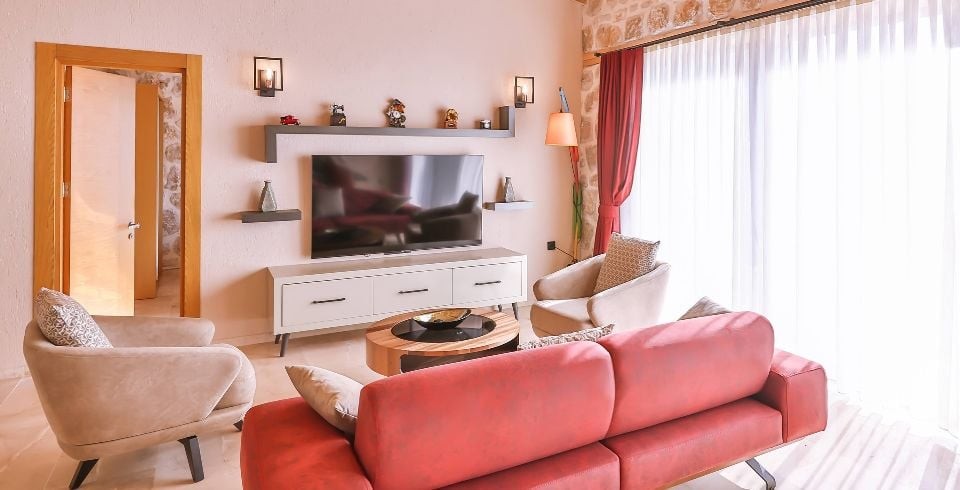 Salon : Büyükçe bir salon içerisinde modern oturma grubu, uydu alıcısı, LCD TV, modem, klima ve havuz terasına çıkış bulunmaktadır.