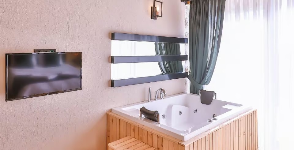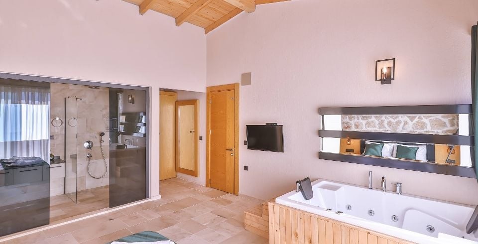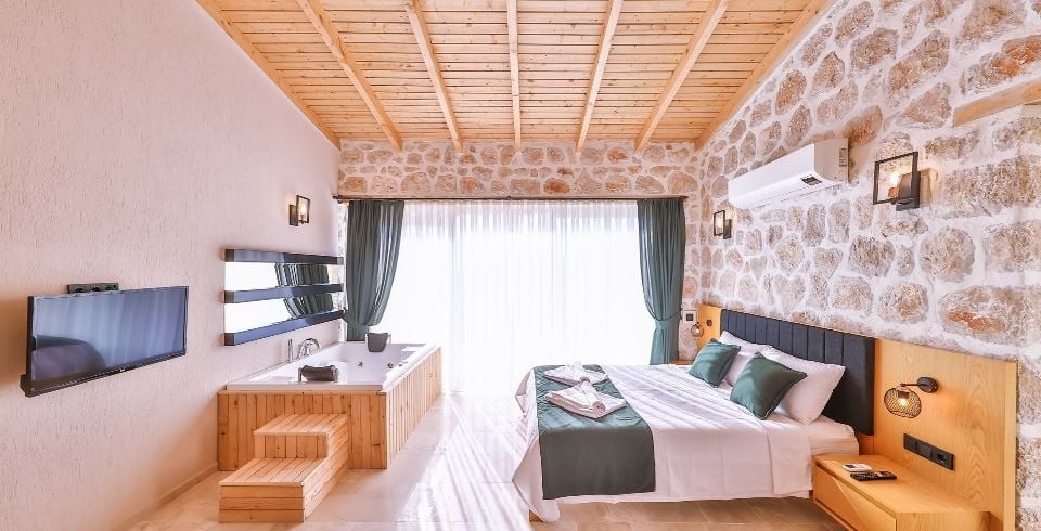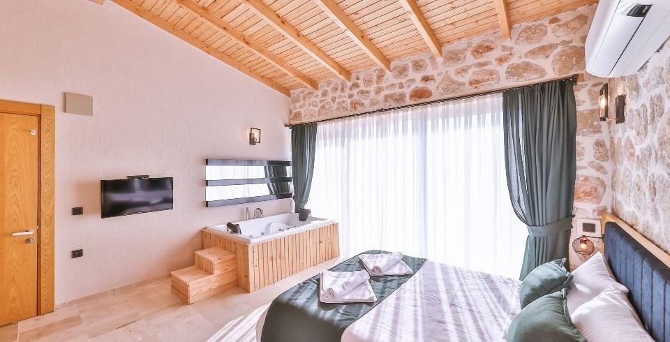 1. Yatak Odası: 1 adet çift kişilik yatak, komodin, makyaj masası, klima, LCD TV, jakuzi ve banyo/WC bulunmaktadır.