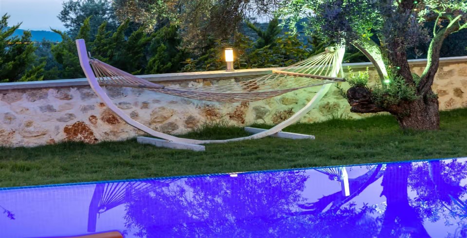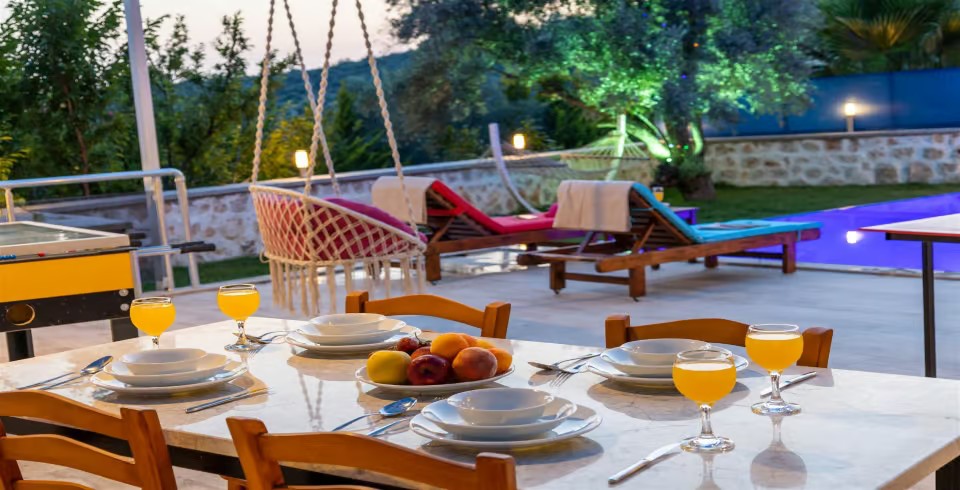 Havuz ve Bahçe: Şezlong, güneşlenme şemsiyesi , salıncak , langırt , masa tenisi , hamak, barbekü , yemek masası ve sandalyeleri bulunmaktadır.