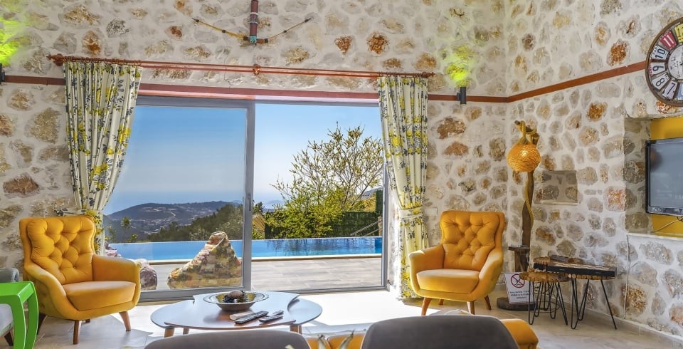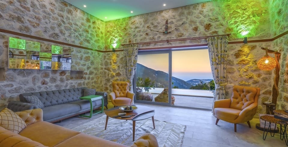 Salon : Villa salonunda konforlu oturma grubu, klima, TV, internet, uydu alıcı, yemek masası, sehpa bulunmaktadır.