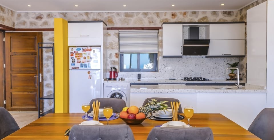 Mutfak : Villamızın mutfağında buzdolabı bulaşık makinası, çamaşır makınası,4 lü ocak, ketıl, 4 kişilik yemek takımı bulunmaktadır.