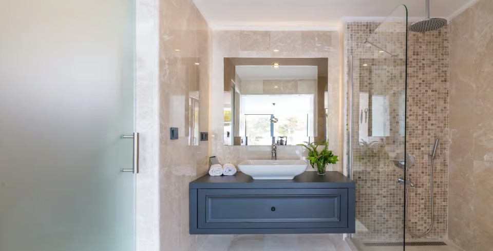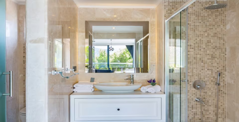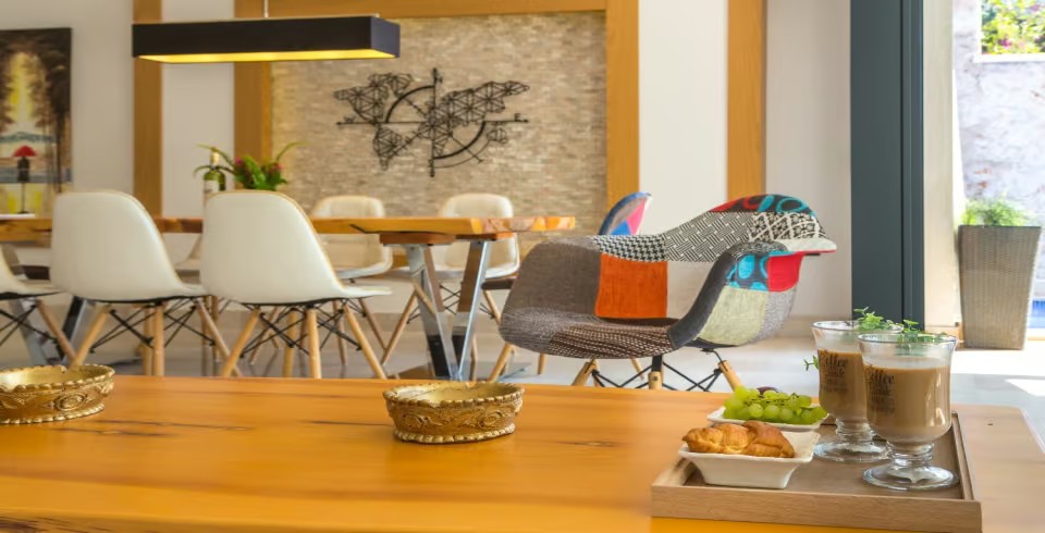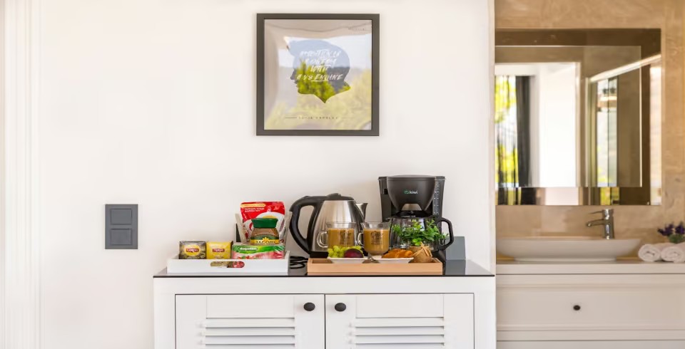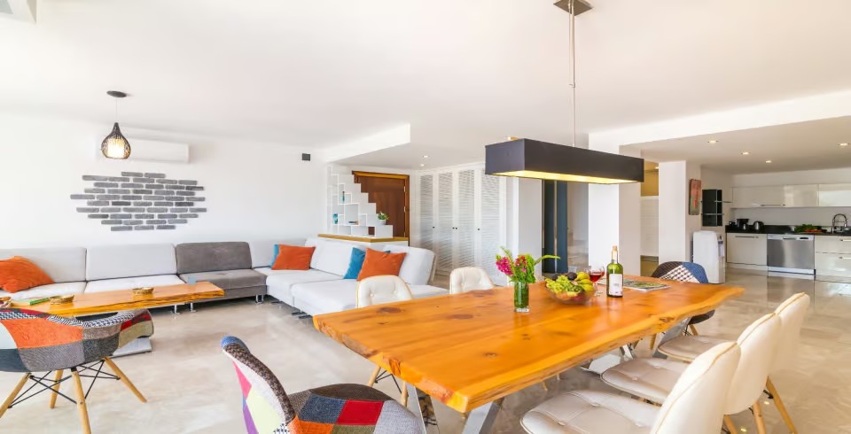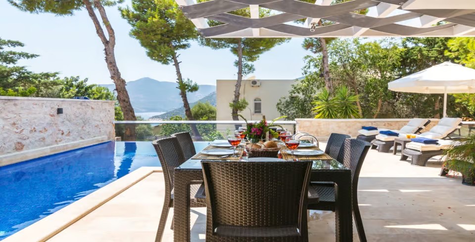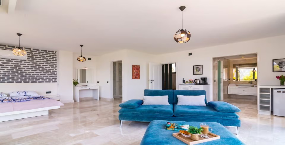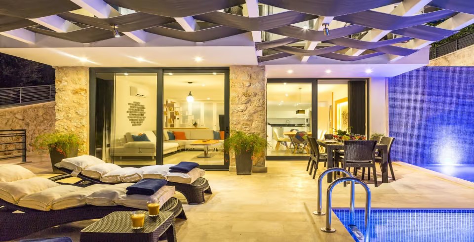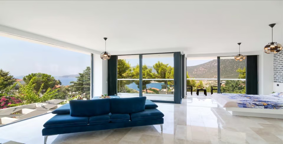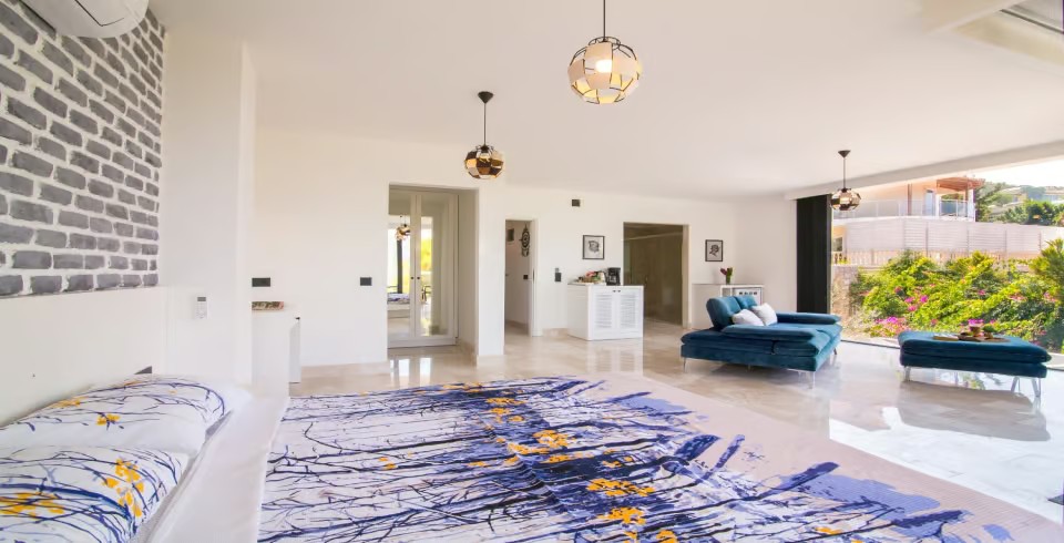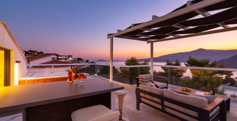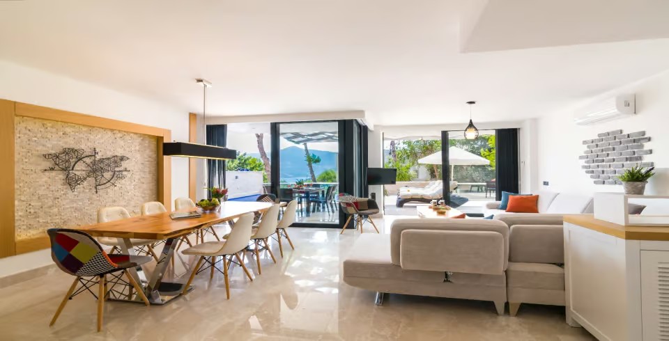 Açık plan salon ve tam donanımlı Amerikan mutfak, geniş cam kapılarla havuz terasına açılmakta ve ferah bir yaşam alanı sunmaktadır. Dış alanda özel infinity (sonsuzluk) havuzu, jakuzi, şezlonglar, gölgeli oturma alanları ve barbekü imkânı yer almaktadır. Teras kısmı ise panoramik deniz ve doğa manzaraları eşliğinde huzurlu vakit geçirme imkânı sağlar.
