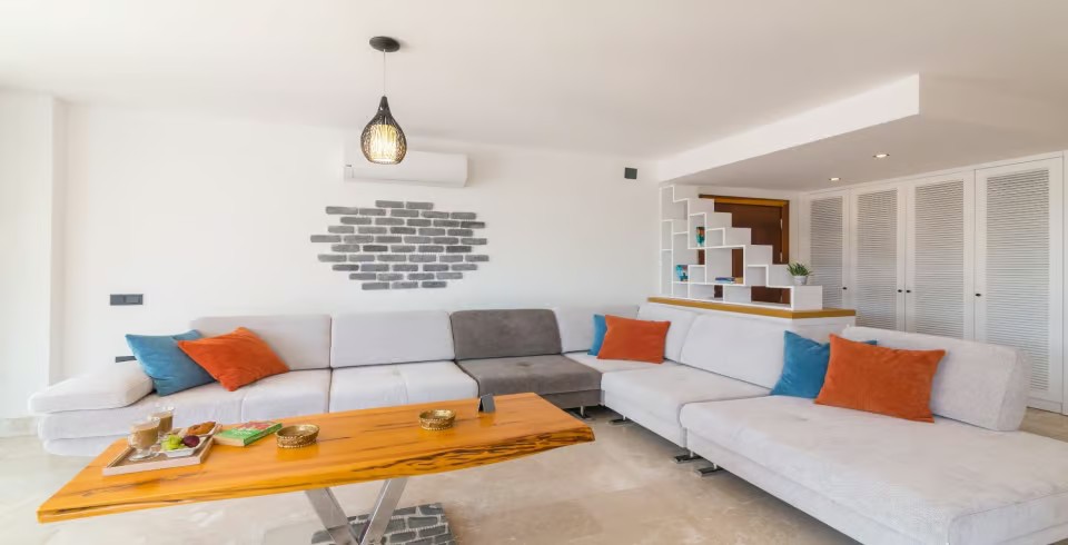 Salon: Geniş ve modern renklerle dekore edilmiş salonun eşsiz deniz ve doğa manzarası bulunmaktadır. Salon içerisinde oturma grubu, uydu TV (LCD), kablosuz internet, klima,8 kişilik yemek masası, havuz terasına çıkış ve ekstra wc bulunmaktadır.
