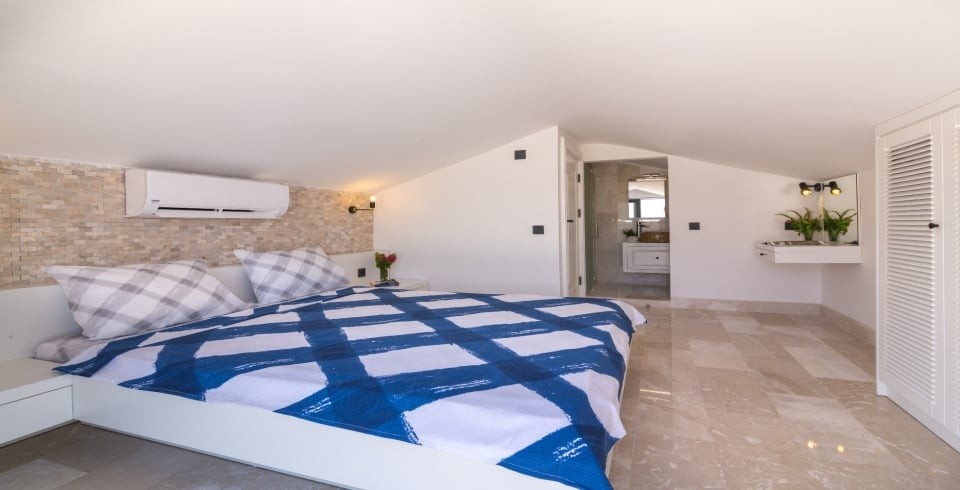 4. Yatak Odası : 1 adet çift kişilik yatak, klima, komodin, elbise dolabı, makyaj masası ve saç kurutma makinesi. Odanın tuvalet ve banyosu vardır.