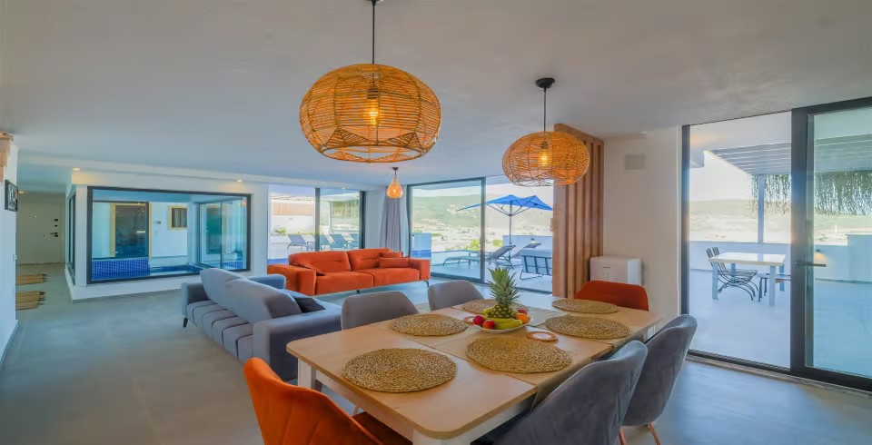 Salon : Villa  salonunda konforlu oturma grubu, klima, TV, internet, uydu alıcı, yemek masası, sehpa bulunmaktadır.