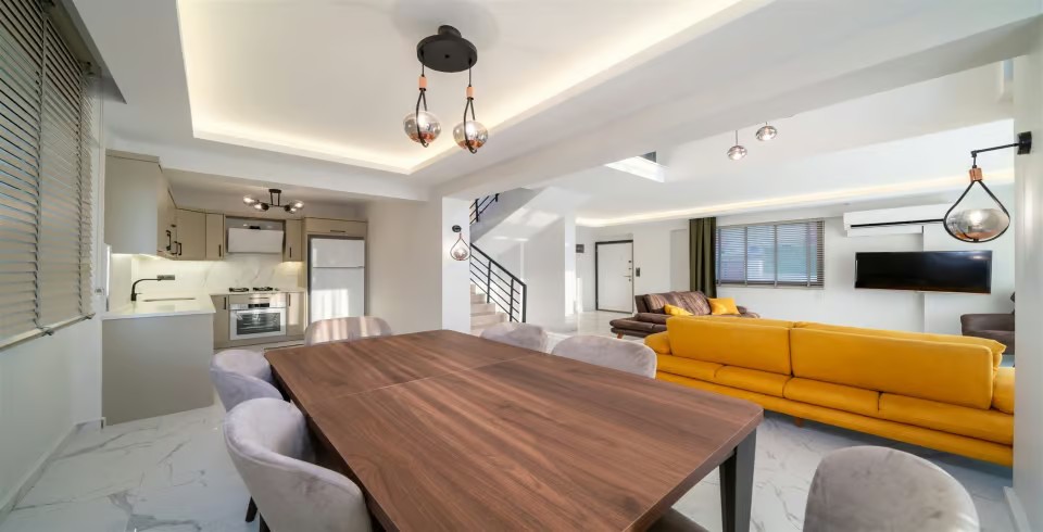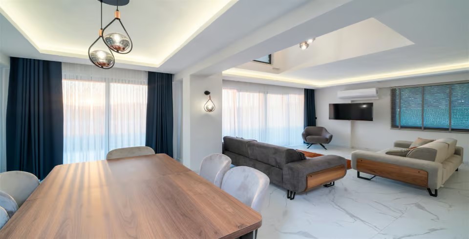 Salon: Oturma grubu, Uydu TV, yemek masası, Klima, Havuz kenarına çıkış bulunmaktadır.