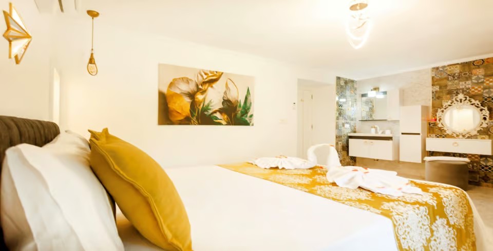 1. Yatak Odası: Çift kişilik yatak, elbise dolabı, makyaj masası, klima, komodin,banyo ve lavabo bulunmaktadır.