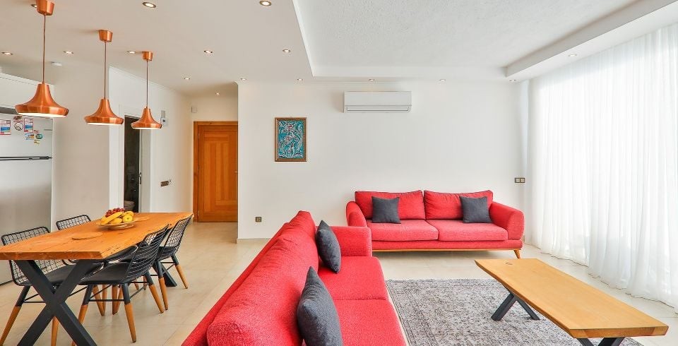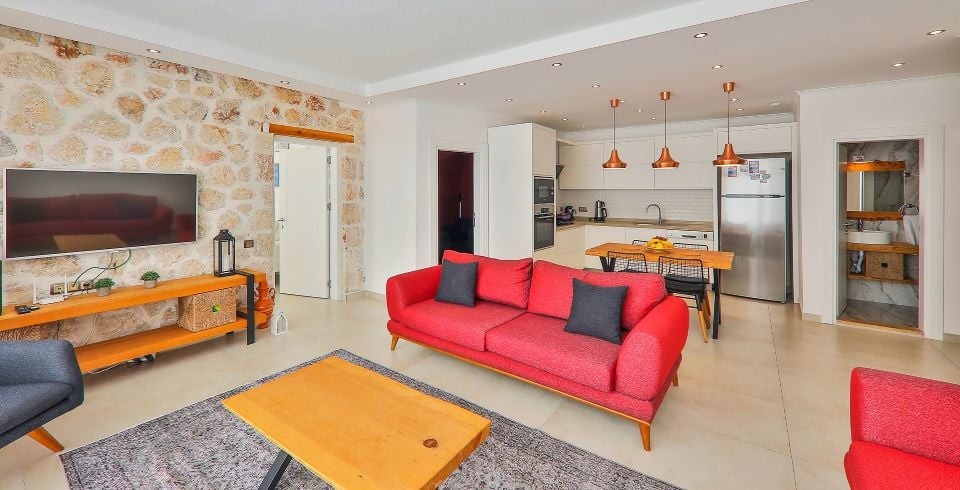 Salon : Villamız deniz manzaralı salonunda, oturma grubu, klima, ütü, ütü masası, TV, DVD, yemek masası, WİFİ havuz basına çıkış bulunmaktadır.