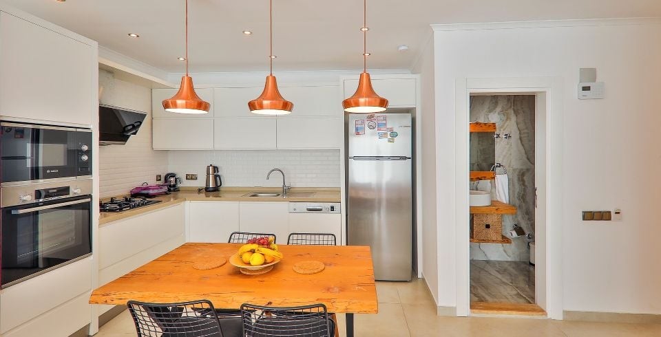 Mutfak : Amerikan mutfakta buzdolabı, çamaşır makinası, bulaşık makinası,4lü ocak, fırın, kettle, ekmek kızartma makinası, 2 kişilik yemek takımı, çatal bıçak takımı ve havuz başına çıkış bulunmaktadır.
