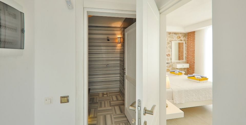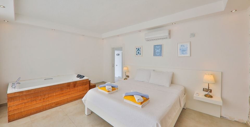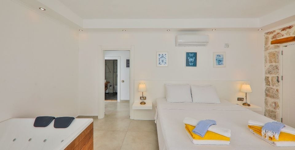 1. Yatak Odası : Çift kişilik süit yatak odası, klima, elbise dolabı, makyaj masası, komodin, lavabo ve banyo bulunmaktadır. Ayrıca jakuzi yatak odası bölümünde yer almaktadır.