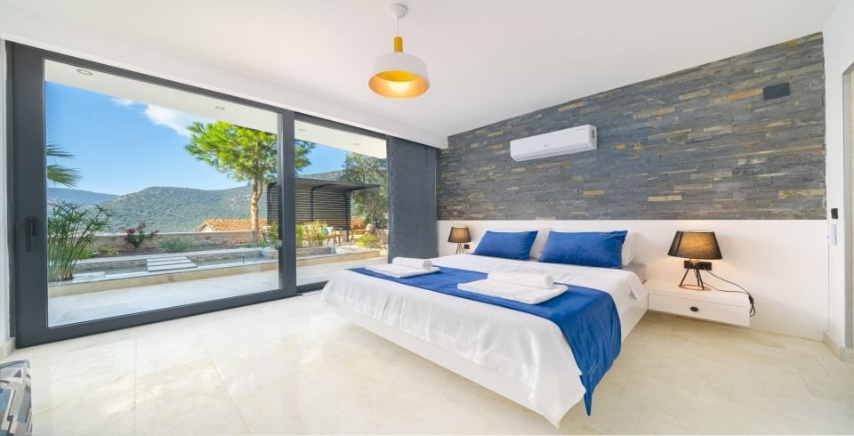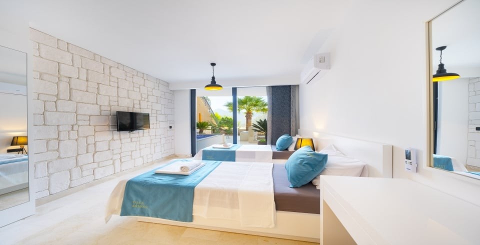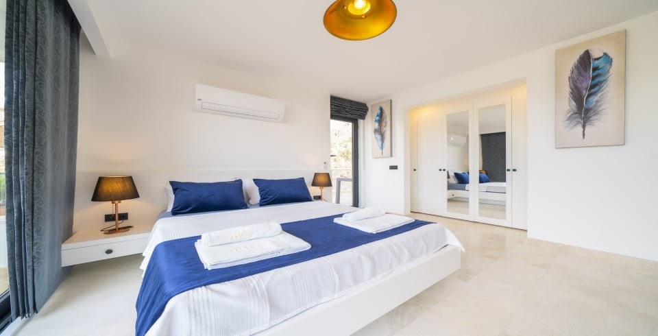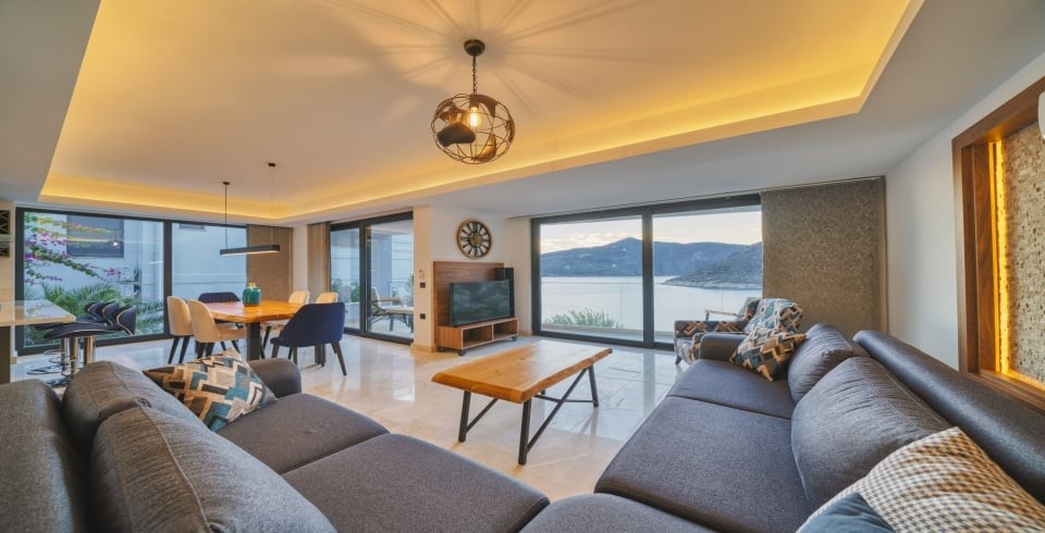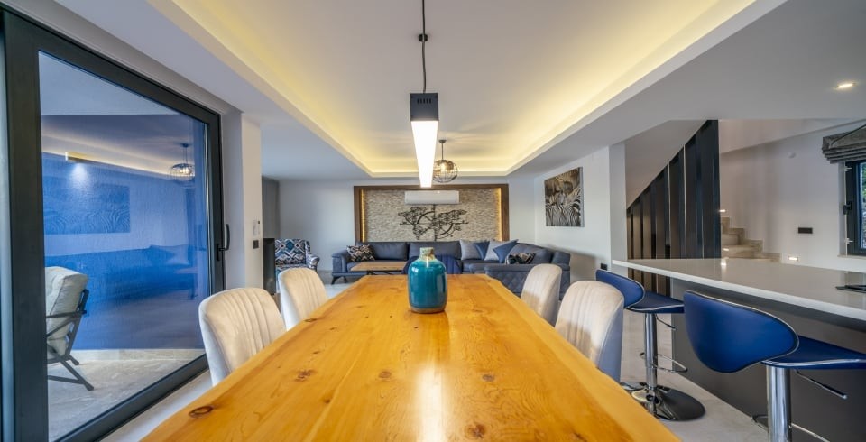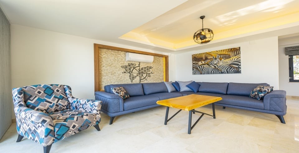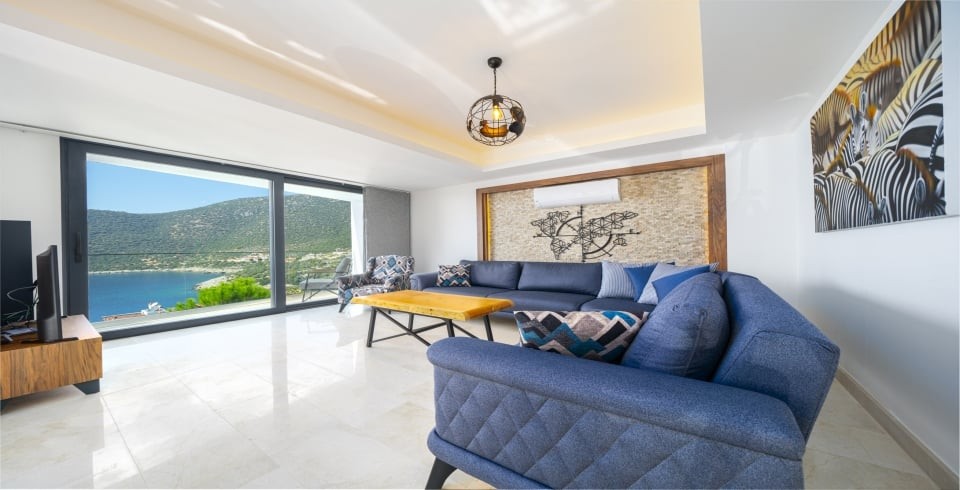 Salon: Geniş ve modern renklerle dekore edilmiş salonun eşsiz deniz ve doğa manzarası bulunmaktadır. Salon içerisinde oturma grubu, uydu TV (LCD), kablosuz internet, klima,6 kişilik yemek masası, havuz terasına çıkış ve ekstra wc bulunmaktadır.