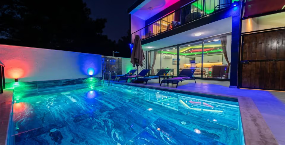 Havuz ve Bahçe : Villamız korunaklı olduğundan dışarıdan görünmemektedir. 1.50 santimetre sığ özel yüzme havuzunun içinde şezlong bulunan bahçemizde ekstra şezlonglar, şemsiye, yemek masası, salıncak bulunmaktadır.