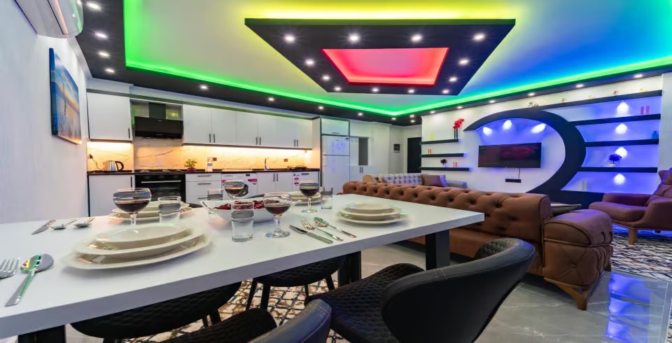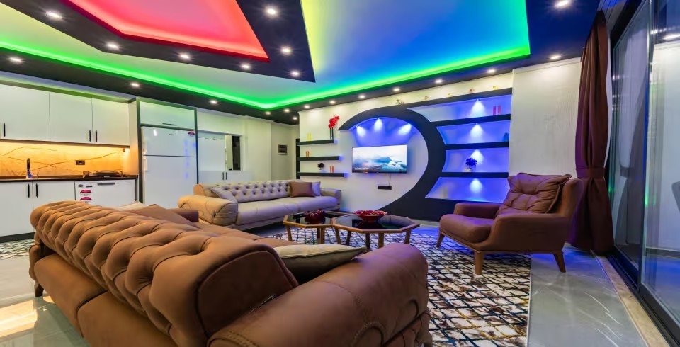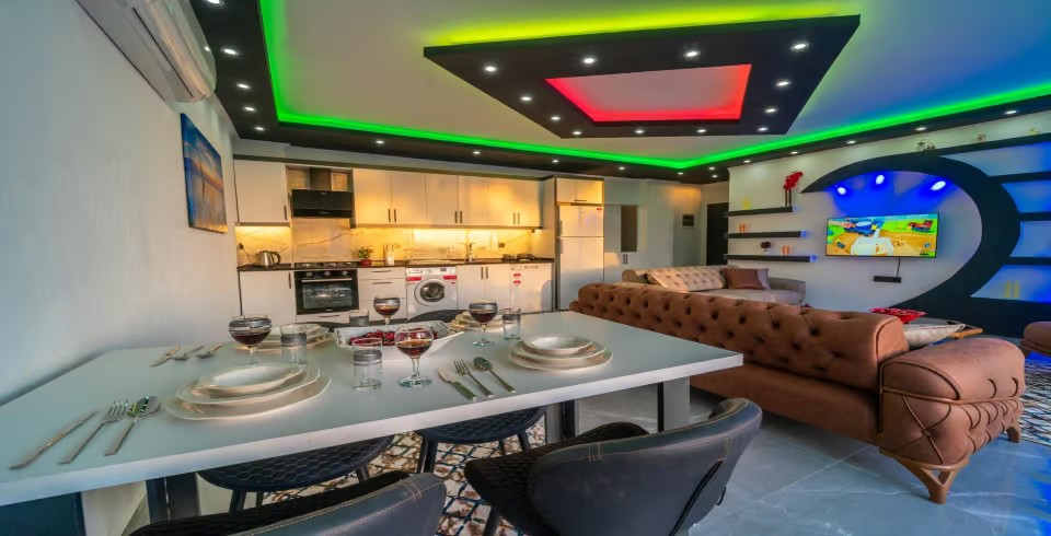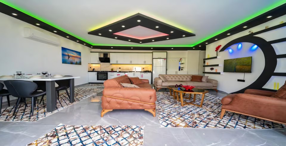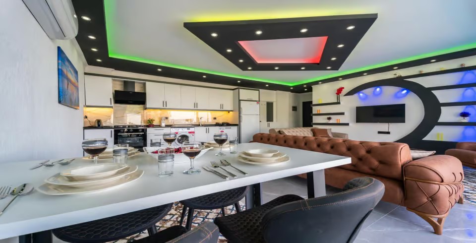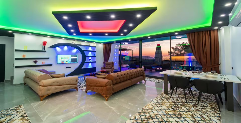 Salon : Villamızın iç dizaynı da son modaya uygun olarak modern bir şekilde tasarlanmıştır. Çeşitli dekoratif eşyalarla süslediğimiz salonumuz havuzlu bahçeye açılıyor. Villa salonunda oturma grubu, TV, internet, klima, sehpa bulunmaktadır.