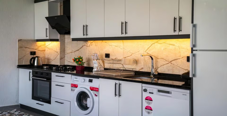 Mutfak : Modern Amerika mutfağımızda  yemek masası, buzdolabı, 4’lü ocak, tost makinesi, elektrikli su ısıtıcısı, çatal-bıçak takımı, tencere-tava takımı, bulaşık makinesi çamaşır makinesi, bulunmaktadır.
