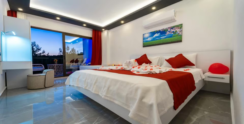 1. Yatak Odası : 1 adet çift kişilik yatak, klima, komodin, makyaj masası, elbise dolabı, jakuzi, banyo ve lavabo bulunmaktadır.