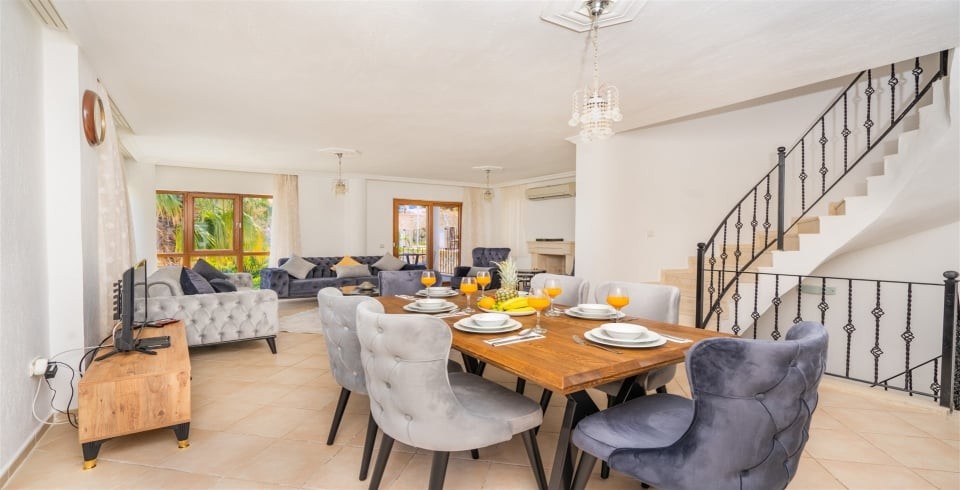 Salon : Villamızın salonunda oturma grubu, sehpa, TV, uydu alıcısı, internet, klima bulunmakta olup salonumuzdan havuz başına çıkış vardır.