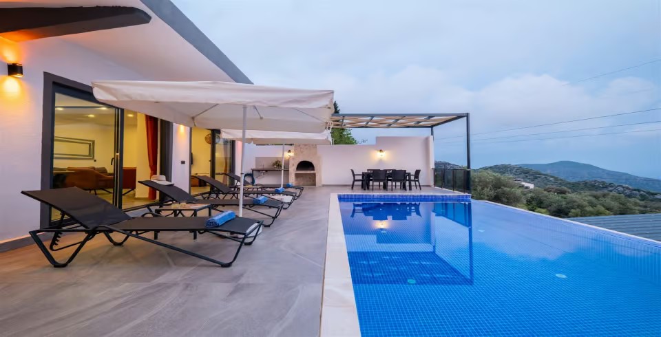 Villa Asya Bella, Kalkan Kördere Mevkiinde bulunan 1 çift kişilik yatağın bulunduğu süit (banyolu) ana yatak odası ve 2 tek kişilik yatağın bulunduğu süit (banyolu) genç odası ile 4 kişilik kapasiteye sahiptir. Villamızın dışarıdan görünürlüğü engellenmiştir bu nedenle muhafazakar ailelerimiz için de uygun villalardan biridir. Kalkan şehir merkezine yaklaşık 2 km olan villamızın ana yatak odasında jakuzi bulunmaktadır. Oturma odası ile birleşik açık plan bir mutfak mevcuttur. Geniş havuz terasında 4 kişilik yemek masası, 4 adet şezlong, 2 adet şemsiye, barbekü için şömine bulunmaktadır. Villamız içinde ihtiyaç duyabileceğiniz mobilya ve mutfak araç gereçleri vardır. Kalkan şehir merkezine yaklaşık 2 km mesafede olup, villamızın konumu ve bölge için mutlaka araca ihtiyacınız olacaktır. Günlük ihtiyaçlarınız için 500 metre mesafede marketler ve cami bulunmaktadır. Villamızın havuzu yerden yüksek olmakla birlikte, havuz terası tente ile kapatılmış ve korunaklı hale getirilmiştir. Muhafazakâr ailelerimiz için ve balayı çiftlerimiz için her şey düşünülmüştür.