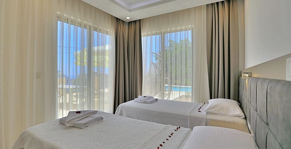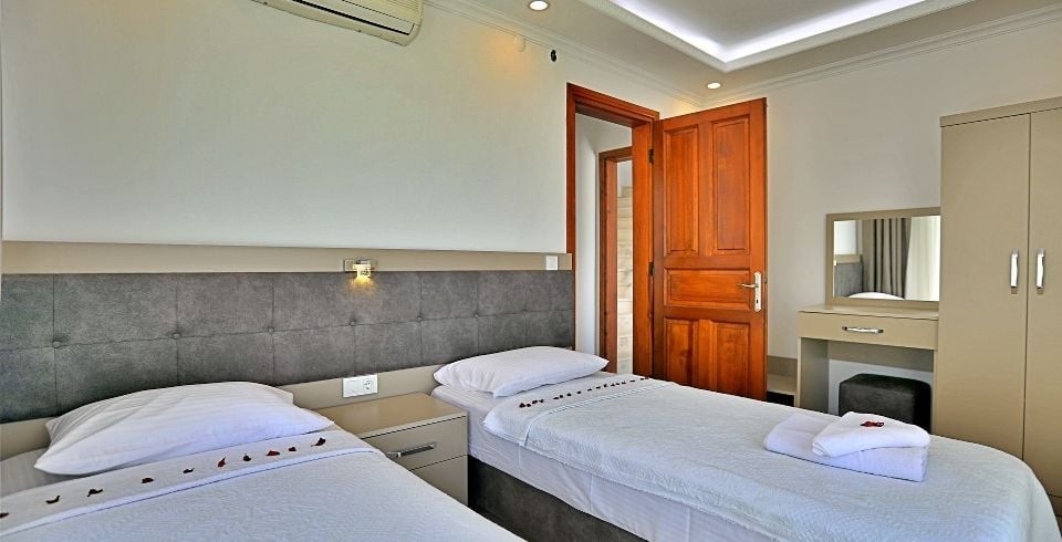 2. Yatak Odası : 2 adet tek kişilik yatak klima, elbise dolabı, makyaj masası, komodin banyo, tuvalet ortak kullanımdır.