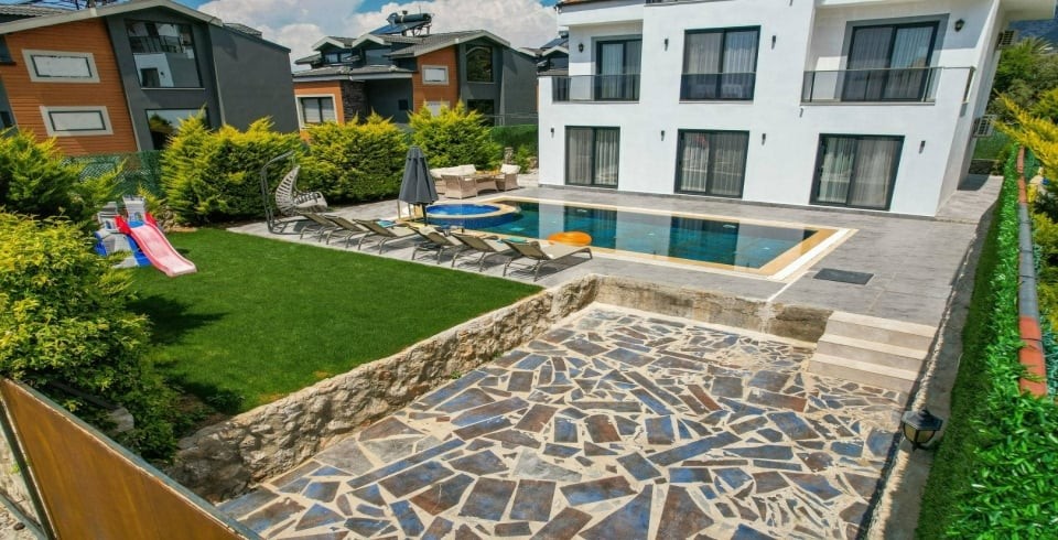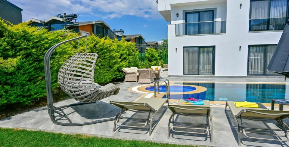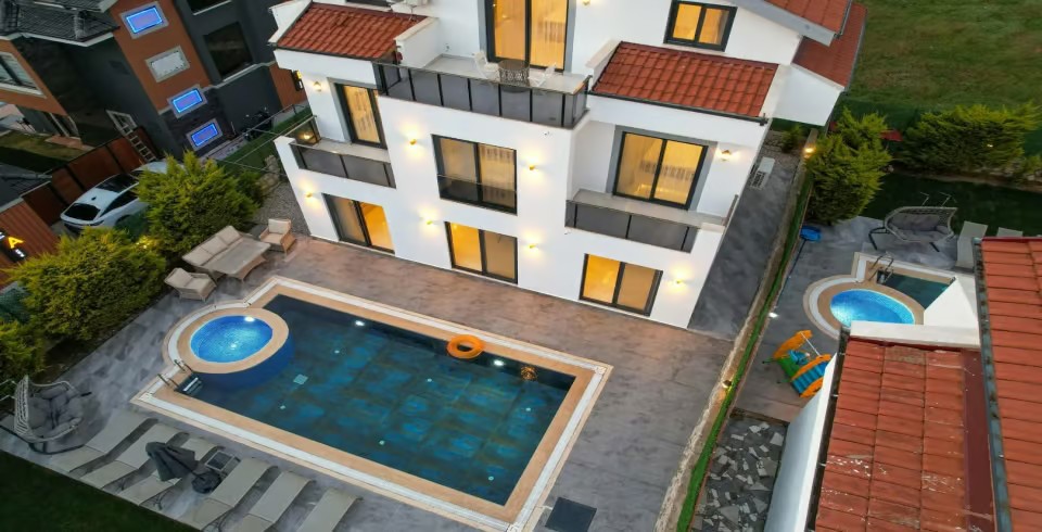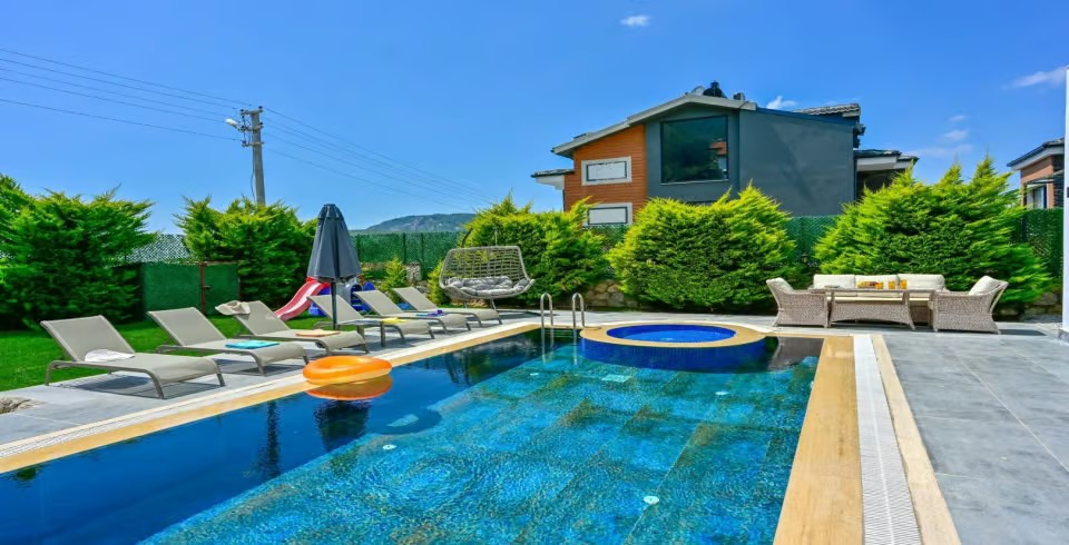 Villanın jakuzisi, dinlenip keyifli anlar yaşamanız için ideal bir alan sunarken, çocuk havuzu minik misafirler için güvenli ve eğlenceli bir ortam sağlar. Geniş bahçesi ise hem oyun hem de dinlenme alanı olarak değerlendirilerek, açık havada keyifli vakit geçirmenize imkân tanır.