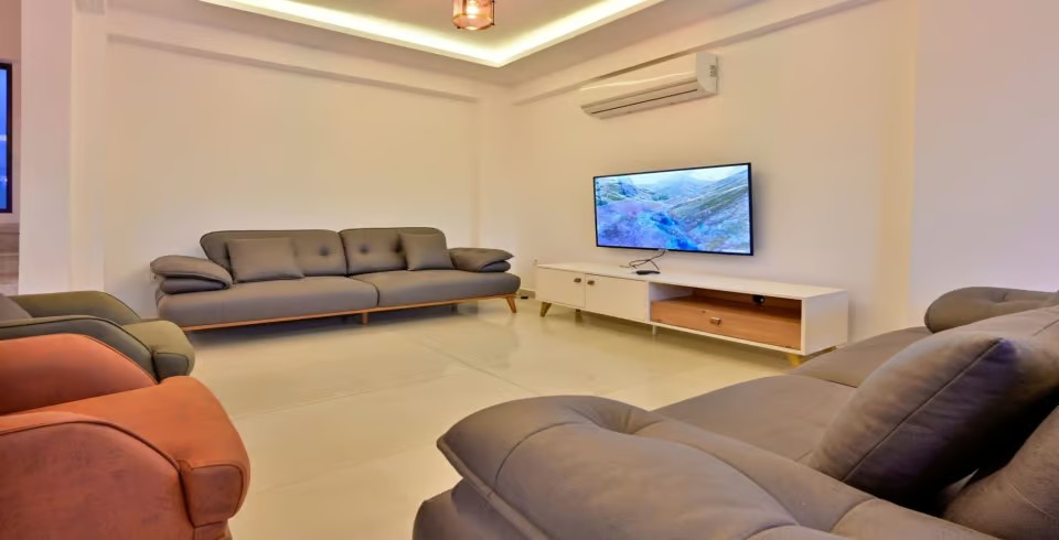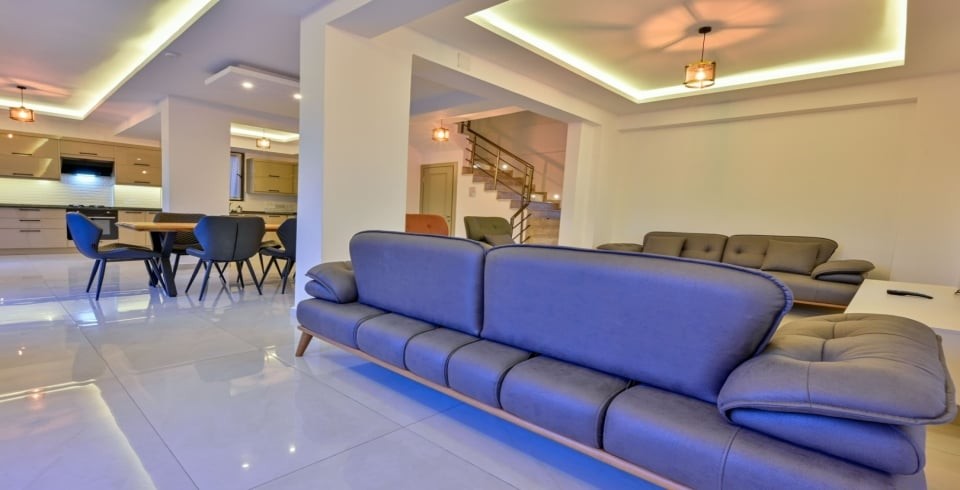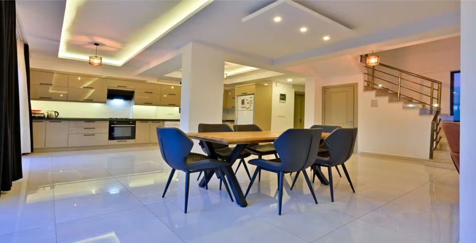 Salon: Özenle döşenmiş salon, modern koltuklar, 8 kişilik yemek masası, LCD TV ve klima bulunmaktadır.